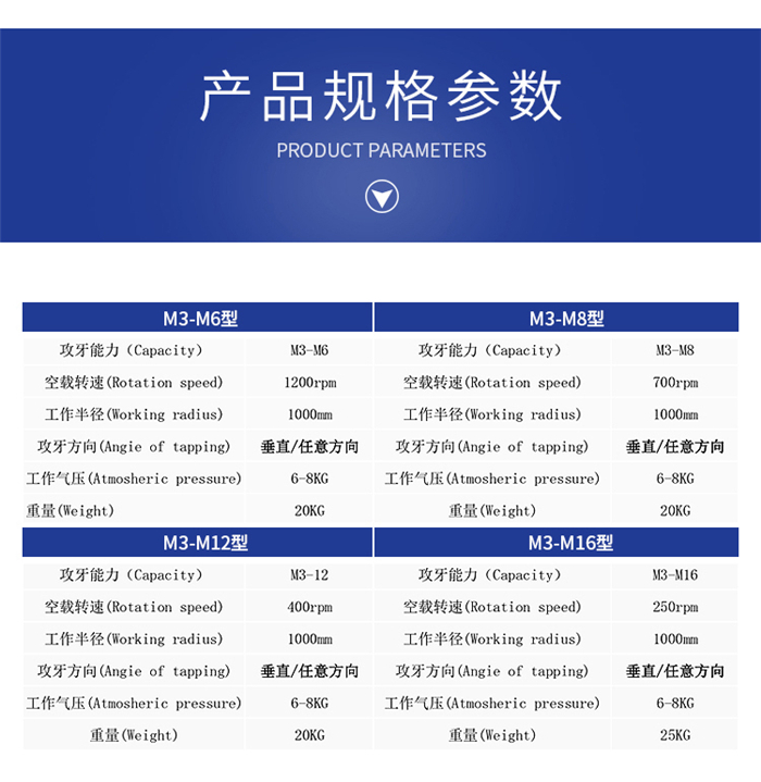 氣動攻絲機適用領域:氣動攻絲機適用于所有機械制造行業(yè),機床、模具機械、塑膠機械、印刷機械、包裝機械制造廠、工程機械、汽車摩托車零部件、航空發(fā)動機、機車車輛、煙草機械以及通用機械等行業(yè)。