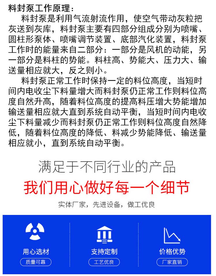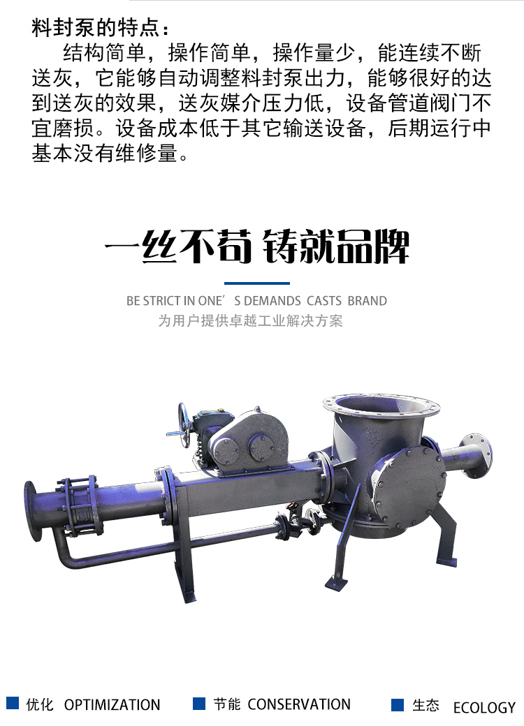 料封泵正常工作時保持一定的料位高度,當短時間內電收塵下料量增大而料封泵仍正常工作則料位高度自然升高,隨著料位高度的提高料壓增大勢能增加輸送量相應就大直到系統自動平衡,當短時間內電收塵下料量減少而料封泵仍正常工作則料位高度自然降低,隨著料位高度的降低、料減少勢能降低、輸送量相應就小,直到系統自動平衡。